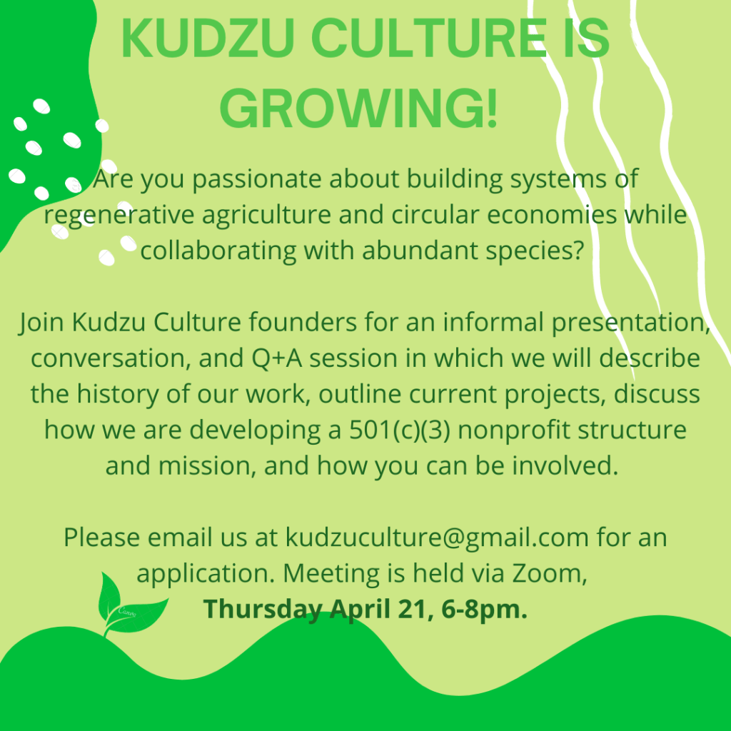 Share this: Click to share on X (Opens in new window) X Click to share on Facebook (Opens in new window) Facebook Like Loading... Kudzu Culture is Growing! April 12, 2022 / Kudzu Culture / Leave a comment