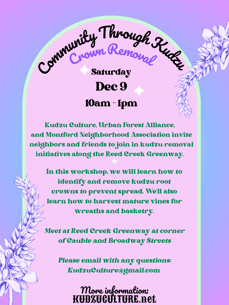 Kudzu Culture, Urban Forest Alliance, and Montford Neighborhood Association invite neighbors and friends to join in kudzu removal initiatives along the Reed Creek Greenway in Asheville, NC.